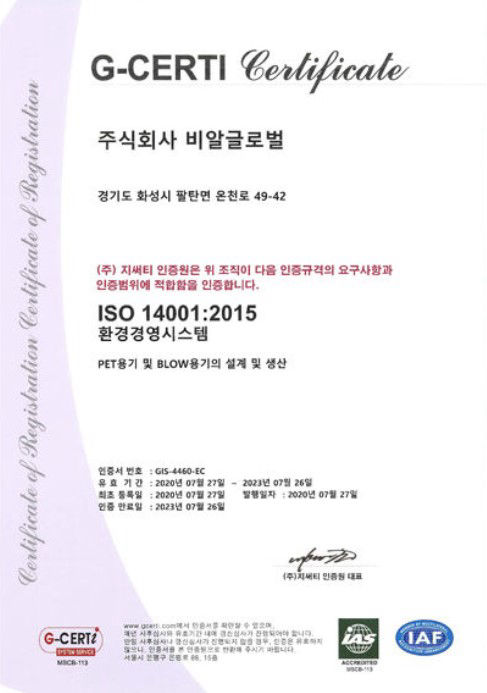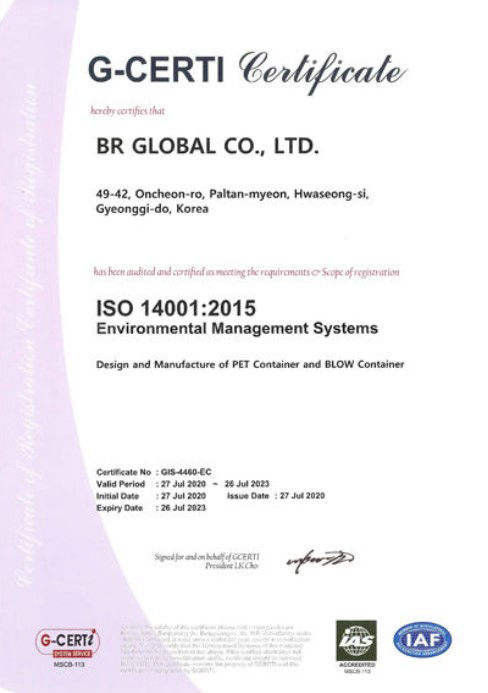 2016년부터 국내외 굵지의 회사 들과 더욱 거래를 활발히 하며 2020년 (주)비알글로벌 신규 법인을 설립하며 브로우용기 신사업을 시작하였습니다. 이에 맞춰 품질경영, 환경경영 시스템 글로벌 표준 인증인 ISO9001, ISO14001을 취득하였습니다.